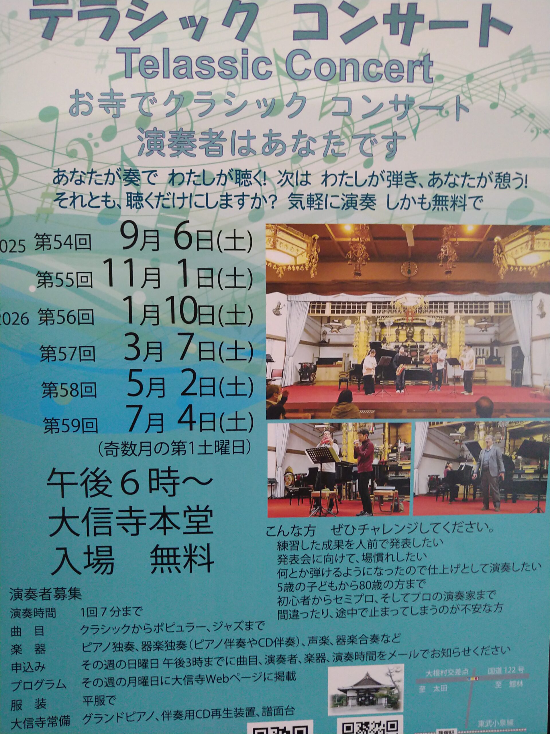 11月最初の日、当ピアノ教室(太田市)講師が、邑楽町の大信寺で奇数月の第一土曜日に開催されている 「お寺”テラ”でクラ”シック”」の『テラシック コンサート』に参加いたしました。