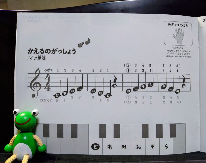 「あのね、この曲(かえるのがっしょう)ね、”かえるのうたがぁ〜、かえるのうたがぁ〜♫”って、弾いてみたんだ!」