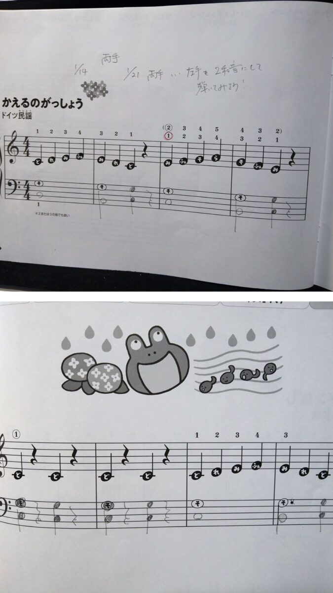 例えば…。Tくんに宿題にした「かえるのがっしょう」(Tくんは以前、この曲を”りんしょう”で弾いてくれました🐸)